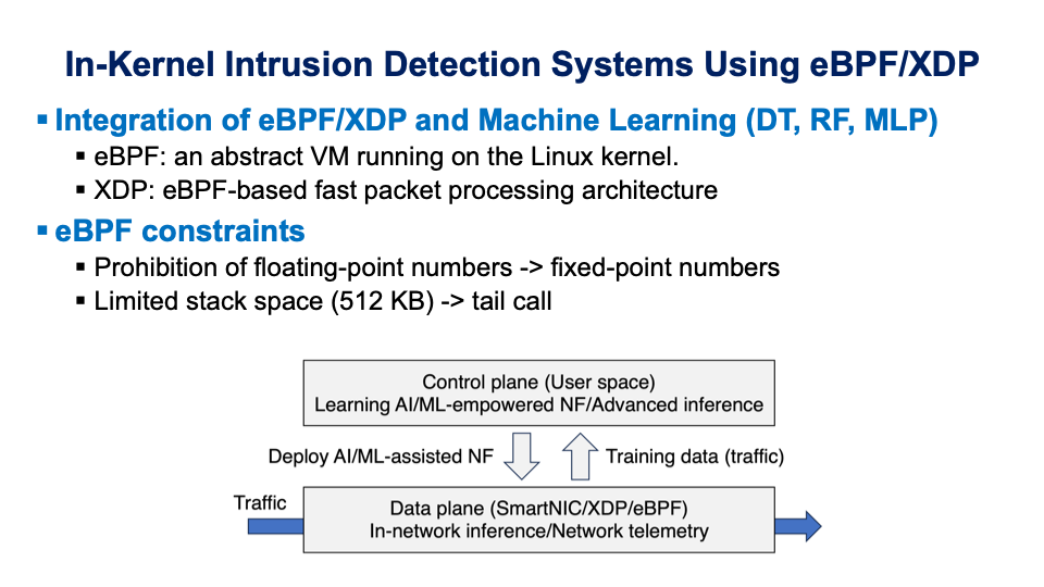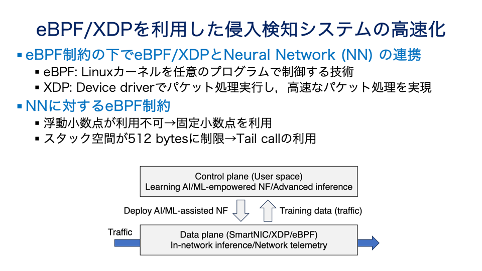 本研究では,eBPFやXDPなどを活用して,カーネル内で効率的に動作するネットワーク機能の実現を目指しています. 従来の高機能なネットワーク機能はユーザ空間で動作するため,ネットワーク機能の実行には,カーネル空間とユーザ空間のコンテキストスイッチに伴うオーバーヘッドが発生します. 一方,eBPFやXDPを用いることで,カーネル内で直接パケット処理を行うことが可能となり,オーバーヘッドを削減できます.ただし,カーネル内で動作するネットワーク機能は,ユーザ空間で動作するものに比べて,計算資源が限られているため,高度なネットワーク機能を実装することが困難です. このような背景の下で,軽量なニューラルネットワークに基づく侵入検知システム (Intrusion Detection System: IDS) をeBPF/XDP上で実装し,カーネル内IDSの実用性を評価しました12. さらに,カーネルバイパス手法の一つであるAF_XDPとの組み合わせにより,ユーザ空間とカーネル空間の両方でパケット処理を行う手法を提案し,その実用性を評価しました3. また,Service Function Chaining (SFC) において,経路逸脱によりサービス要件を満たさないパケットを検出するために,eBPFを用いたOrdered Proof of Transit (OPT) による経路検証手法についても検討しています4.