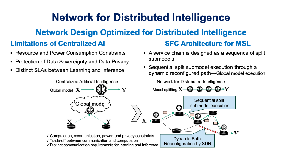 AIの大規模化に伴い,分散知能(Distributed Intelligence)が注目されています.特に,モデル分割に基づく推論や学習は,複数のノード群をネットワークを介して協調させることで実現される. 特に既存のMulti-hop split inference/ learning (MSI/MSL) では静的な通信経路に依存しているため,学習や推論のコンテキストに応じた柔軟なEnd-to-Endの通信経路の確立が求められています. 本研究では,Service Function Chaining (SFC) とMSIの類似性に着目し,MSI/MSLを支えるSFC基盤を確立することを目的としています1. また,非同期的学習やMulti-path TCPを利用した高速な推論基盤の実現やモデル分割・配置・データルーチングの最適化問題の定式化についても検討しています.