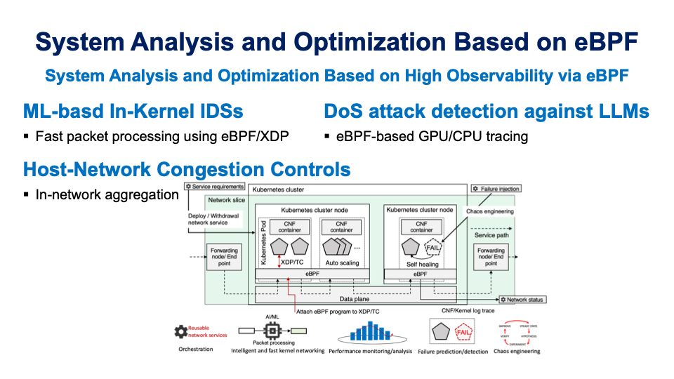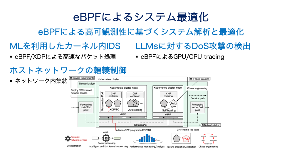 本研究では,BPFの特性を活用して,侵入検知システムの高速化,ホストネットワークの輻輳制御,GPUトレーシングに基づくLLMへのDoS攻撃の検出といった研究課題に取り組んでいます.